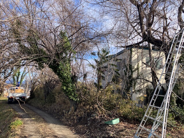 その後、道路や建物に影響している樹木の伐採を進め、最後に屋根まわりの清掃も行いました。