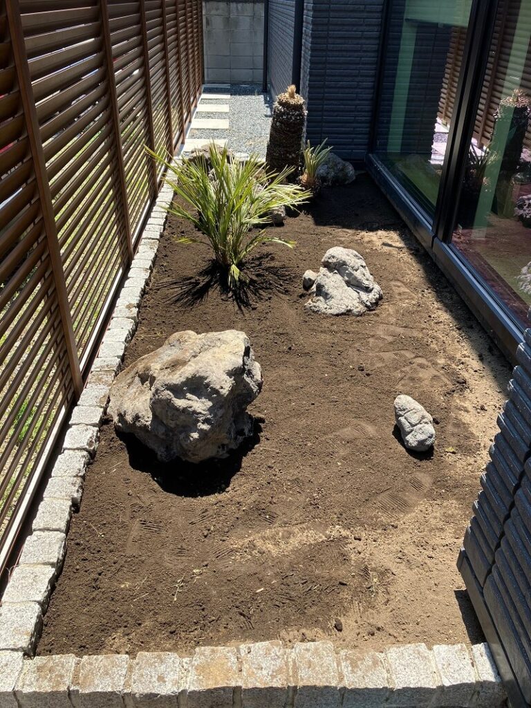 最近はおしゃれな石や砂利、ヤシ系植物を使う庭が増えています。